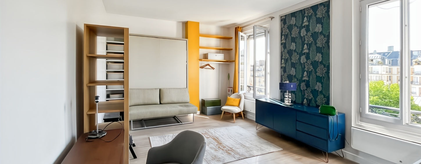 Situé au 4ème étage sans ascenseur, ce grand studio lumineux avec vue dégagée se compose d'une entrée, un double séjour avec deux fenêtres, une cuisine et une salle d'eau avec toilette.